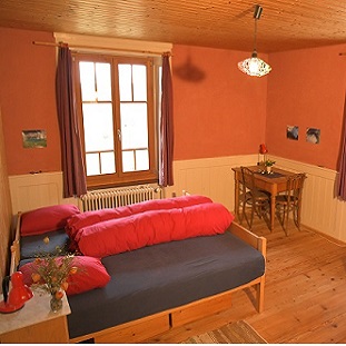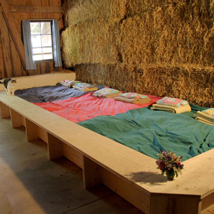 Durant les mois d’été, d’environ juin à septembre, nous préparons des lits de paille confortables pour 6 à 8 personnes. WC, douche et une cuisinière sont à disposition. (Photos de dormir sur la paille)