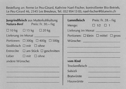 Wir freuen uns über Bestellungen per Telefon, Mail oder Post. Sie können die Produkte bei uns abholen. Je nach Wohnort liefern wir sie oder schicken sie per Post-Express. Wenn Sie noch Fragen haben, rufen Sie uns ungeniert an, oder schreiben Sie eine Mail, wir geben gerne weitere Auskünfte.